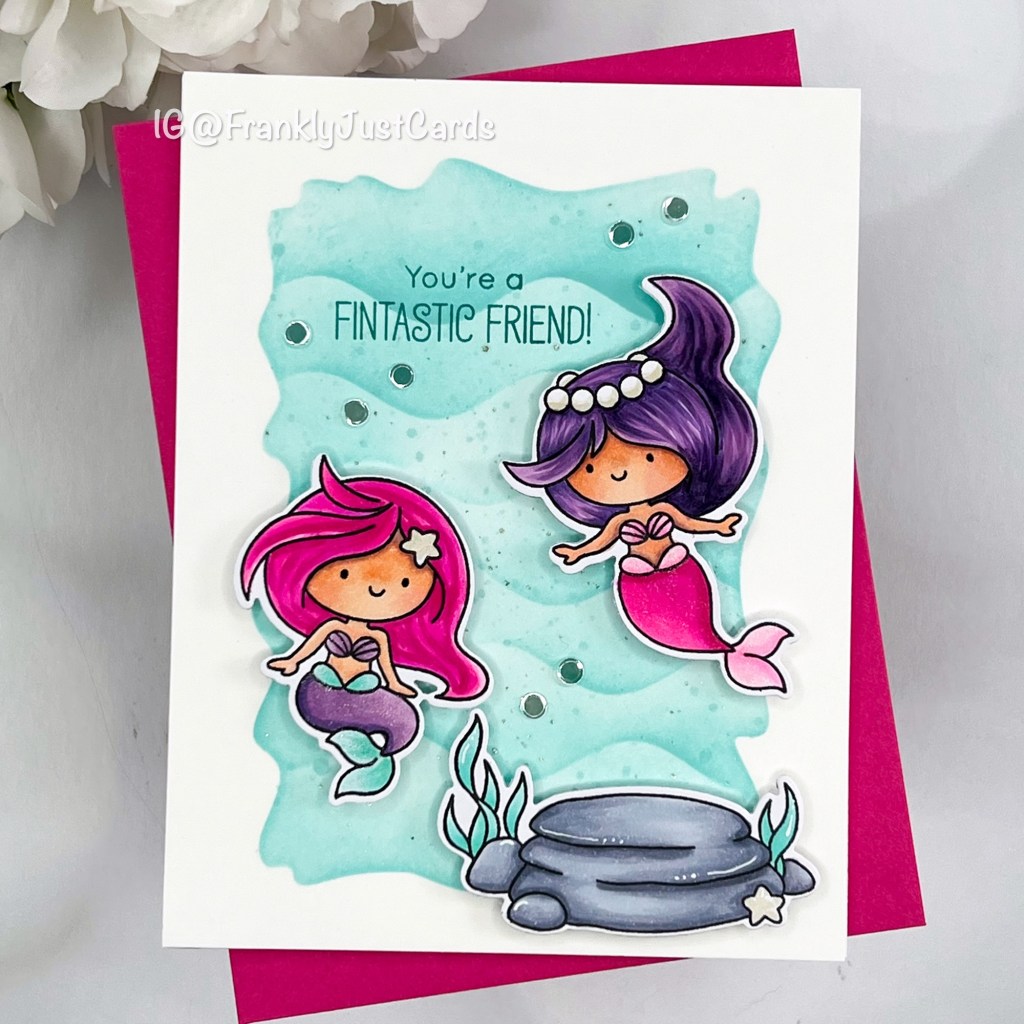 Started off with the Making Waves stencil over the Top of Watercolor Wash Rectangle Stencil ink blended on Summer Splash ink. Did some extra splatters with the ink watered down. Also some Lawn Fawn Pixie Dust.