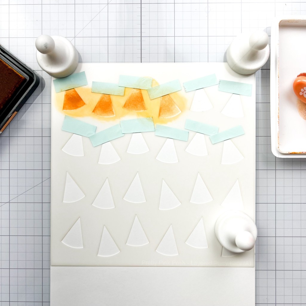 1. Masking of the top of the Layer Party Hats Layer A. Ink blending on Lawn Fawn Fake Tan and Pumpking Spice ink.