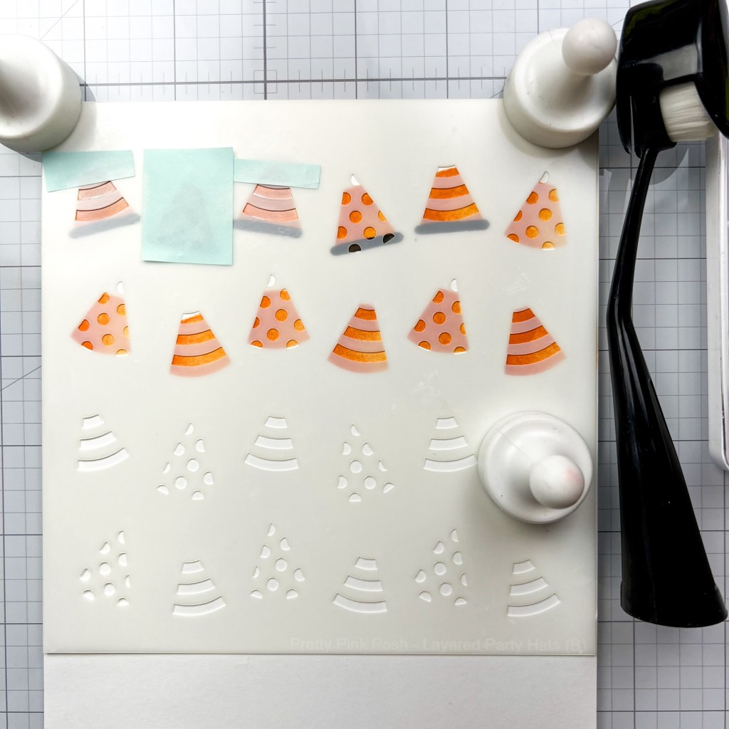 3. Take Layered Party Hats Stencil – layer B place over, you will have to slide around to positions over the ones that have the Dots. Mask off the top and sides. Blend on a white Pigment Ink for the stripes on the Safety cones.