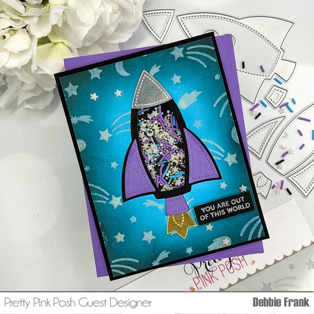 Die cut the tip of the Rocket Ship out of a Silver Metallic card stock, wings from MFT Grape Jelly. The flames from a Gold Metallic card stock.