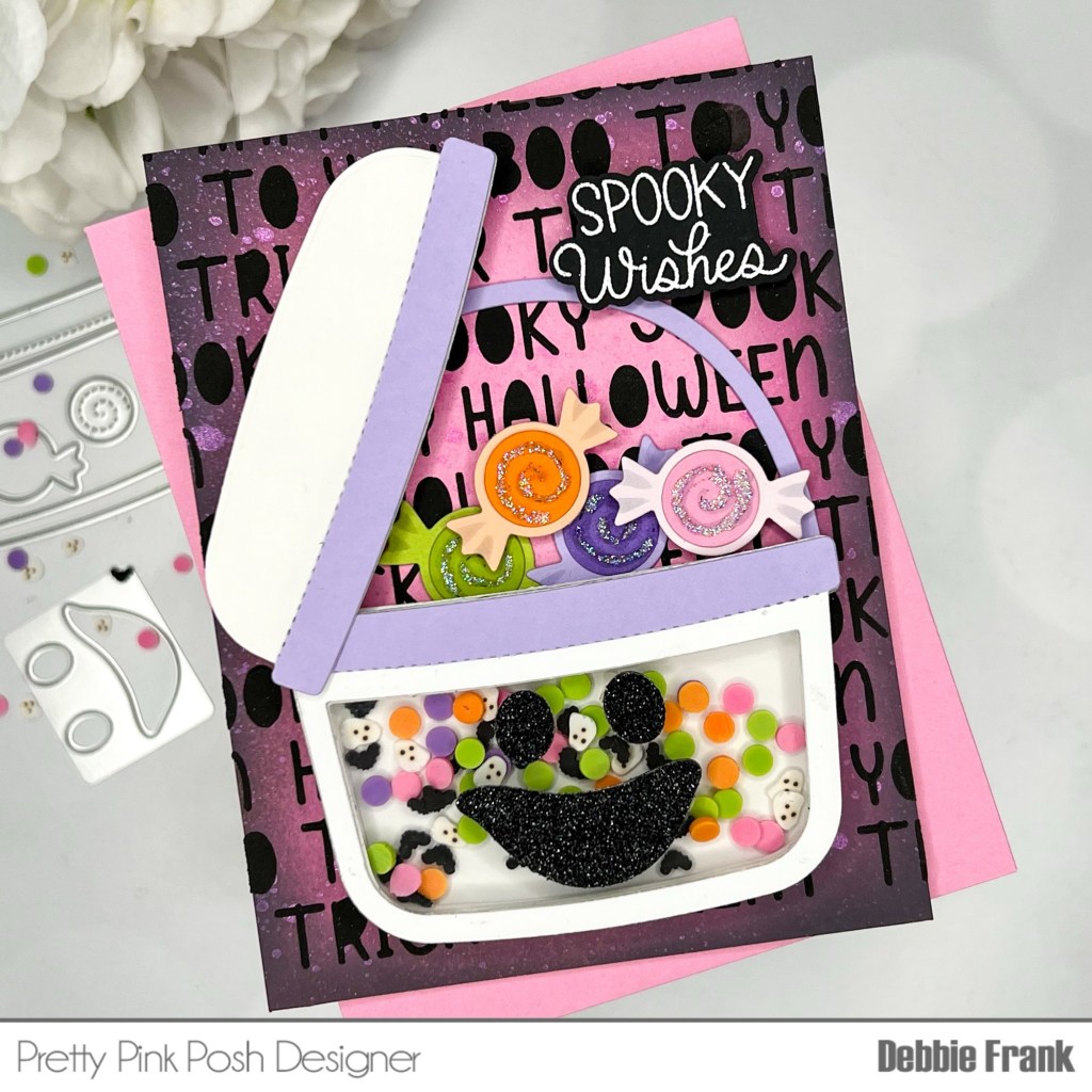 Then Die cut out the Candy Bucket from White card stock and White Foam. Also don’t forget with the whole bucket to die cut out some acetate for the shaker window. Add the new Spooktacular Mix in the well and then Adhere the bucket together. The lid has a lot of foam squares under it to make it flush. The handle is attached directly to the panel with liquid glue.