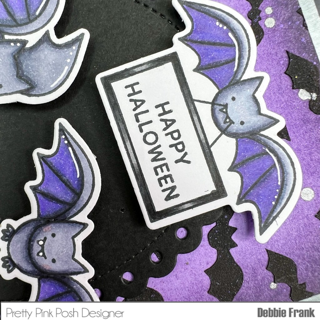 Die cut out the second to largest Eyelet Oval Die from Black card stock. Stamp and Copic color the bats from Batty About You Stamp Set and Halloween Signs Stamp. After the coloring was done I die cut out the images with their Batty About You and Halloween Sign coordinating dies. Add 3D foam to the back of the images and attach it all together. Last I did add highlights with a white gel pen.