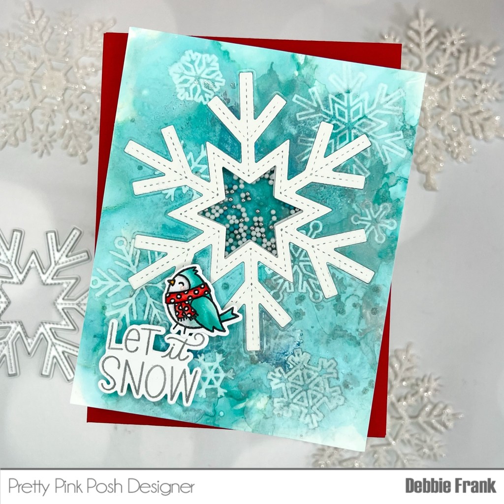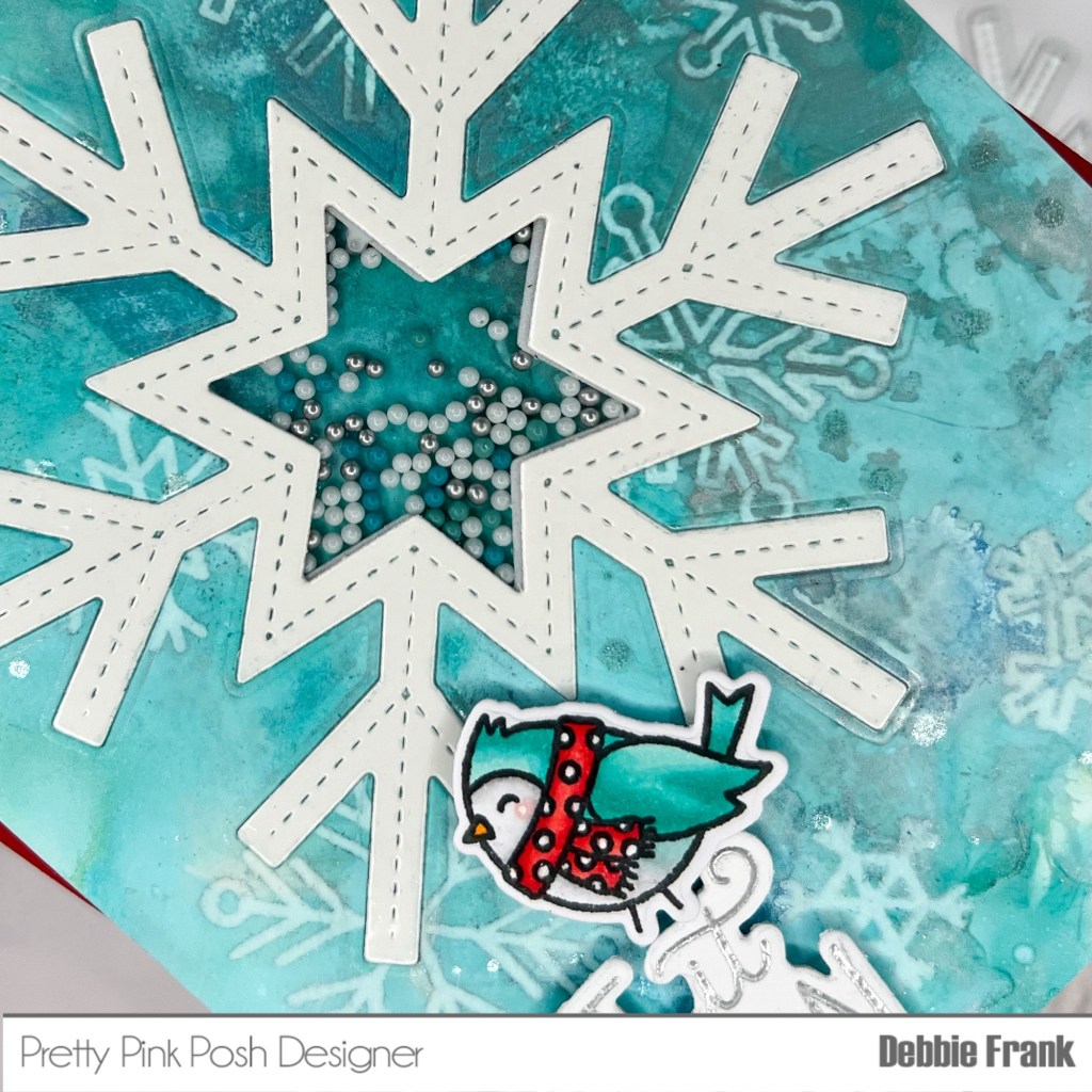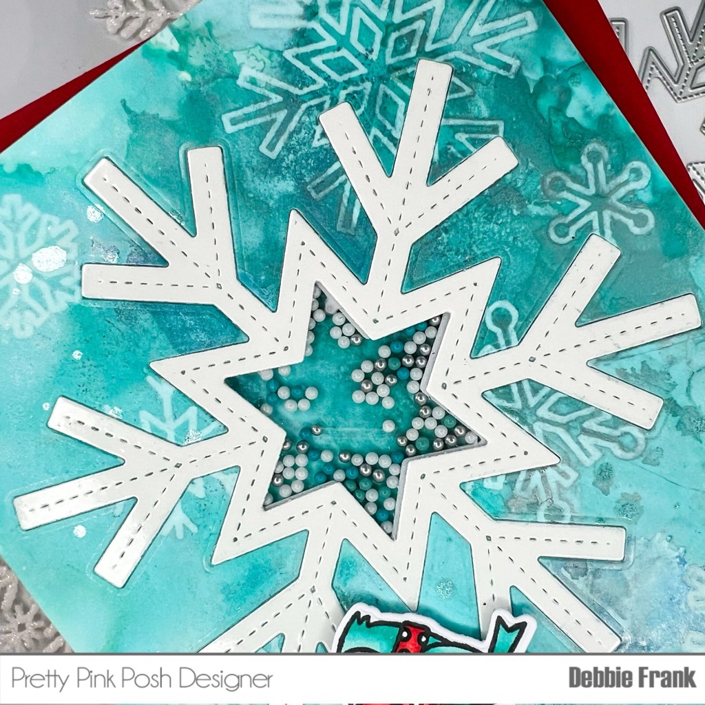Add thick foam tape around the window to make a well for the Snow Days Shaker Beads. Attach the Snow flake frame to the front of the panel. Add the beads in the well and then carefully attach the base.