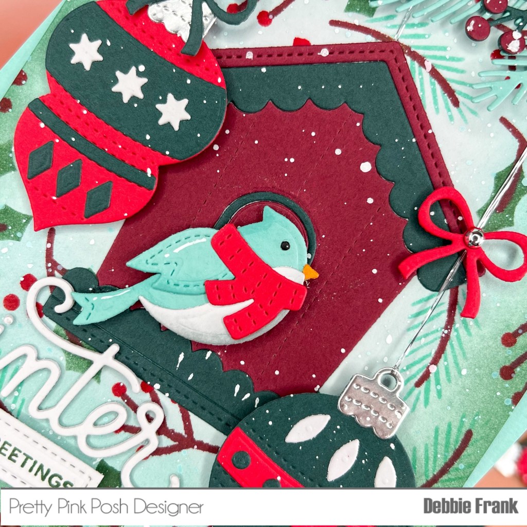 Knowing for the center of the stencil Wreath I wanted the Decorative Birdhouse Die and the Holiday Birds Die. Attaching the Birdhouse directly to the stenciled panel. The Winter bird was adhered and then 3D foam squares to the back of it.