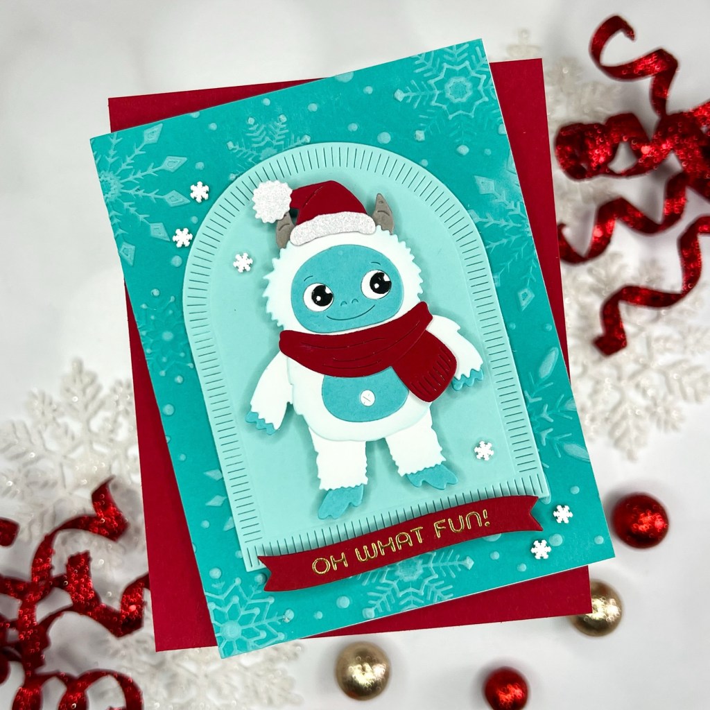 Adhere it all together with liquid glue, with the exception of the Yeti and the sentiment. They are popped up with foam squares. Just finished with some snowflake embellishments.