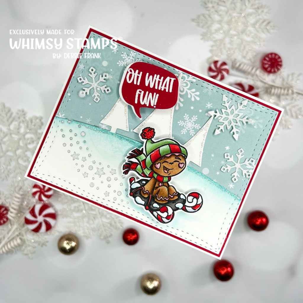 Pop up the Gingerbread man and the sentiment with foam squares. The snowflakes were adhered directly to the panel with liquid glue.