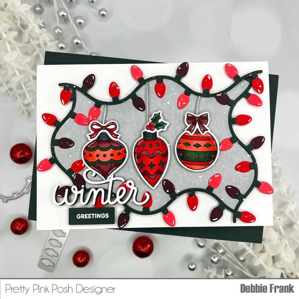 Once all the string of lights are attached then add the Ornaments with the strings. Run the silver string in between the garland string and the gray center. Flip over and adhere the silver string to the back and tape down. Then add 3D Foam squares to the back and attach to the 5X7 Card base.