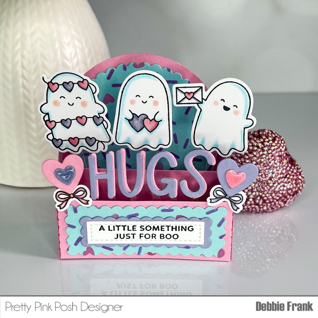 To make the ghosts fly and the Hugs stand up I used Acetate. Die cutting the Pop Cake sticks from the Pop Cake Die set and the smaller ones are from the Valentine Bucket Additions Dies. Use glue dots to adhere to the images and the box.