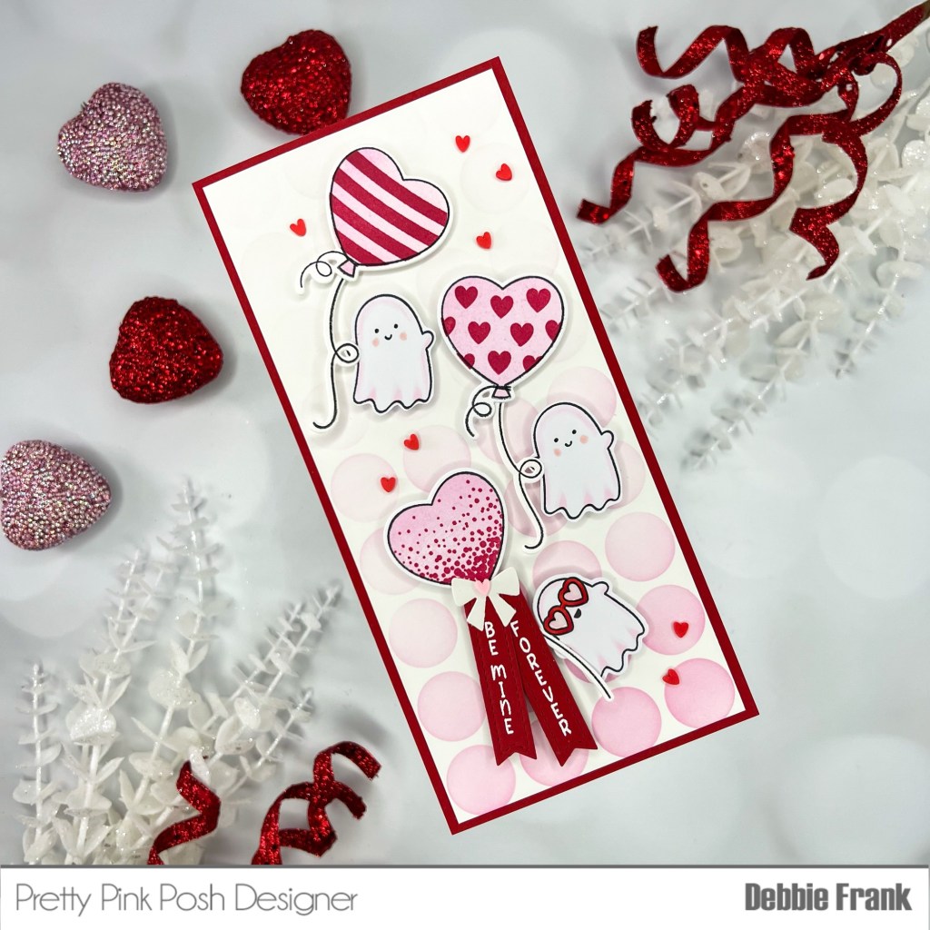 Hi friends, how cute are these PPP Ghosts?! When I got the new the Valentine Release all I did at first was play!! I started off making a bunch of the new Heart Balloons Stamp from pinks, reds, and purple inks. Then die cut out with the Coordinating Dies. I did find it best to die cut out the string die and then lay in the string stamp in your Misti.