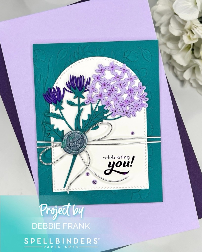 To start off my project I embossed a A2 darker green teal card-stock panel with the Field Notes Embossing Folder. Then a panel of Hammermill I did a purple foil from the Altenew Celebration Sentiment Press set. Then, I die cut it out with the third largest die from Perfect Touch Arches and Tag Die set. With the same green teal cardstock I die cut out the greenery and from a lavender and dark purple the flowers were die cut out. In the middle of the lavender flowers I did some inking with a very small round brush, then added some purple Stickles. Also I did die cut out the flowers twice and over laid them to have a fuller Hydrangea flower. The Field Note Twine was die cut out from a Matt Silver. Instead of adding the center of the bow, I added the Mini Wax-Butterfly Seal, it was a melted teal and silver waxes. Super pretty! Lastly was to add three lavender baubles.