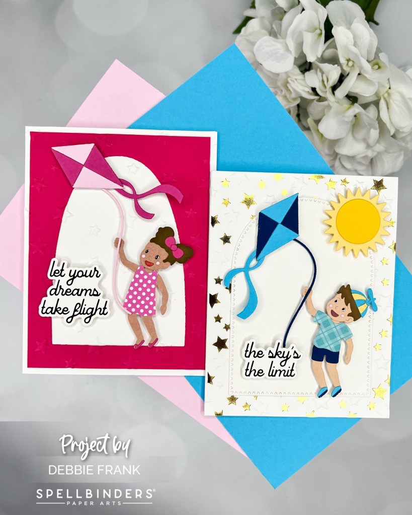 Boy Card: Did the foil and embossed back ground with the Wishing and Falling Stars 3D Folder Bundle. And with a panel of Neenah card stock I die cut out with Perfect Touch Arches and Tags Die. Adhered it to the embossed panel and popped the boy and kite on along with the sentiment. Then with the Tunnel Clouds Die Set I die cut out the sun and popped it up with foam squares.