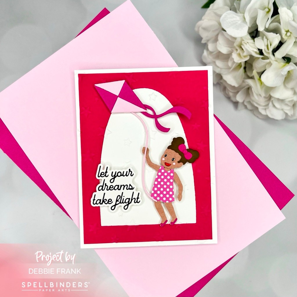 Girl Card: With a bright pink card stock I first die cut out the center with the Arch Labels and Tag Die Set and then embossed with the Wishing and Falling Stars 3D Folder. Next I then trimmed it down by 1/4inch. With a panel of Neenah card stock through with the folder as well, matching up the stars of both panels. Then I popped up the girl and the kite on to the panels.
