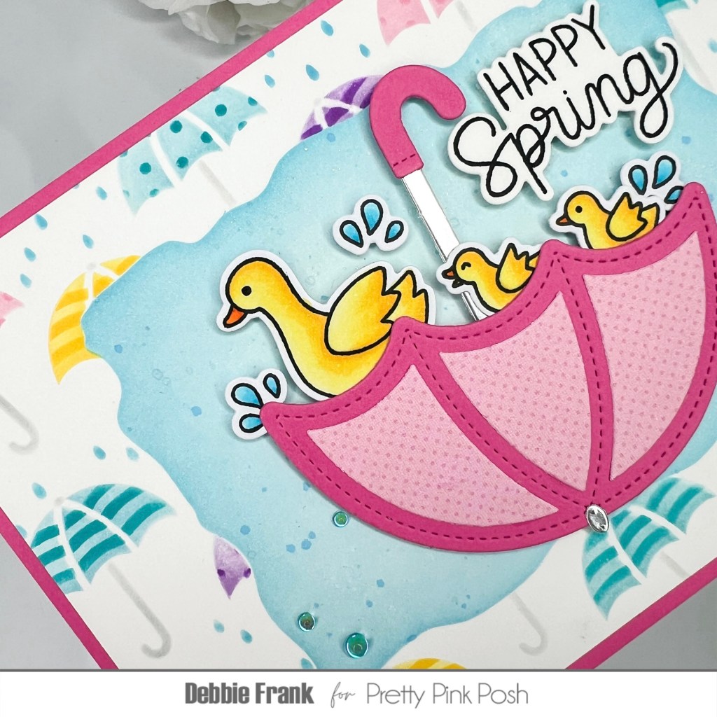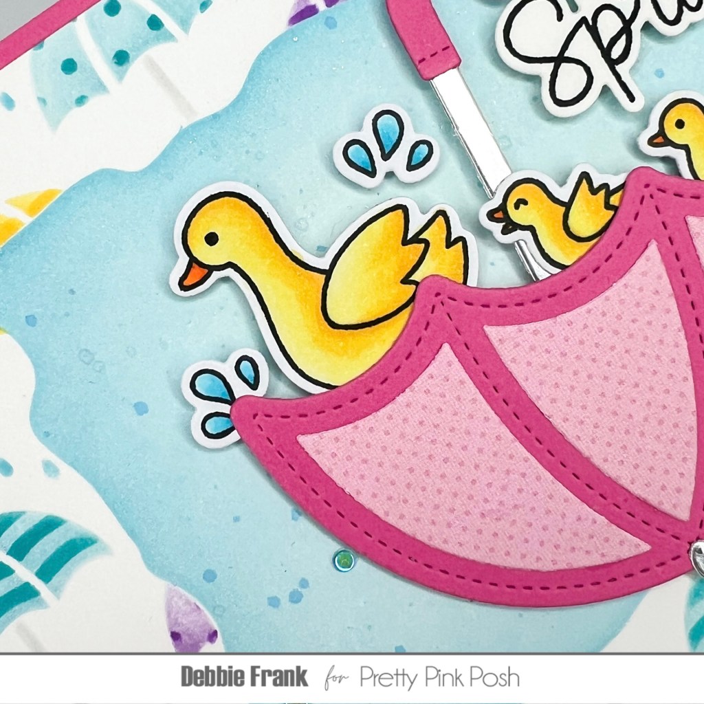 Of course the duckies would be splashing some water out of the umbrella. I found the perfect droplets from Spring Chicks Stamp Set. Colored the water up and with the Coordinating Dies die cut them out.