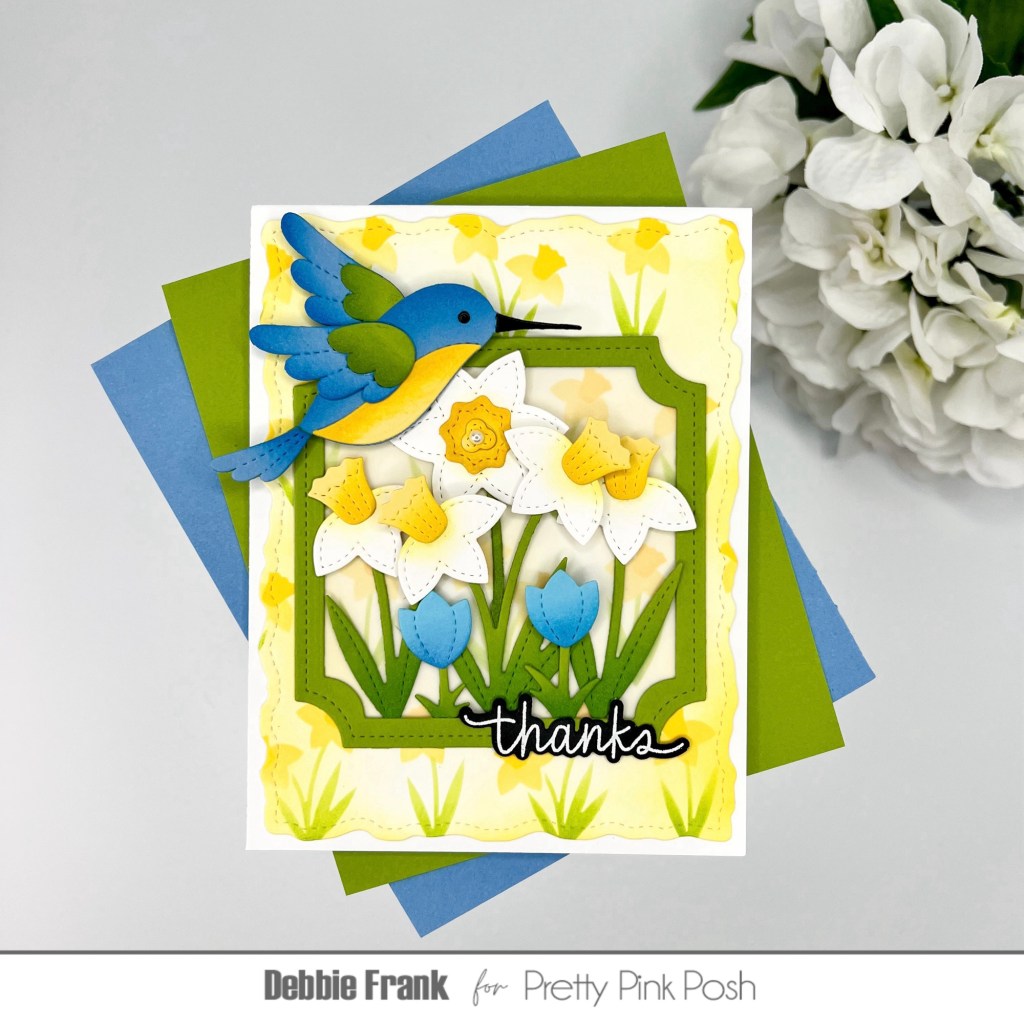 For my card today I chose to play with the Stitched Hummingbird Dies and the Spring Florals Dies. But first I needed my background which was an easy fix with the Daffodils!