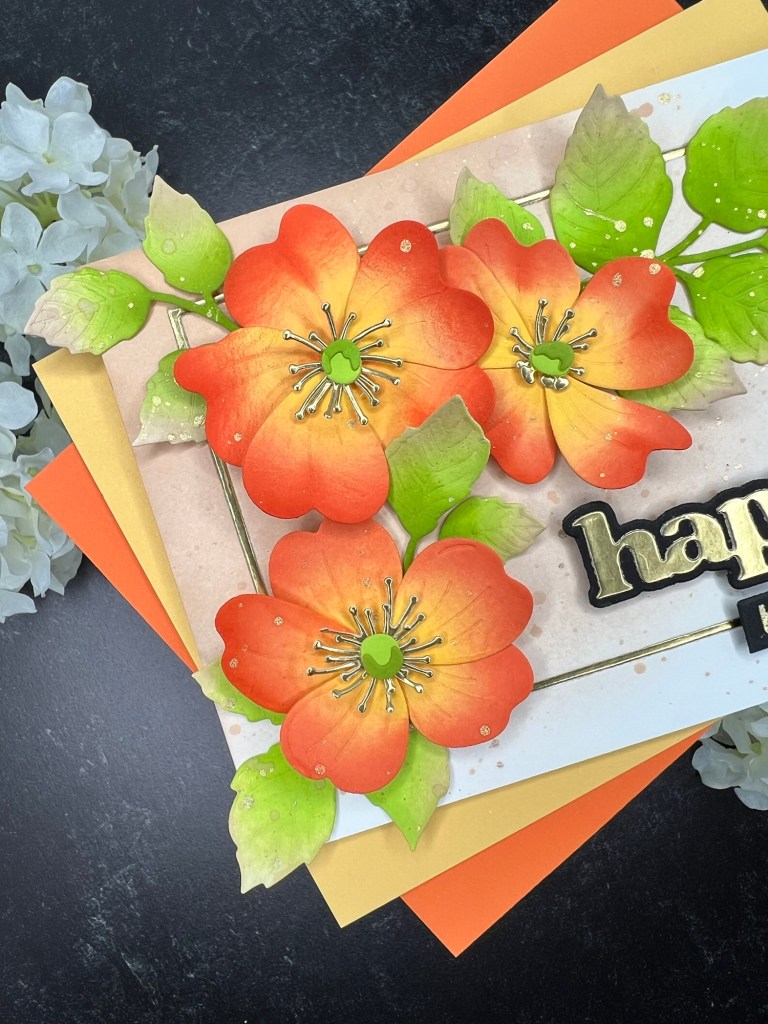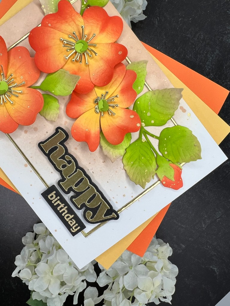 Before I started to lay out my design with the flowers, I needed a sentiment. With the Versatile Greetings 2 die set, I die cut the shadow from black and the top Happy from the Gold card stock.