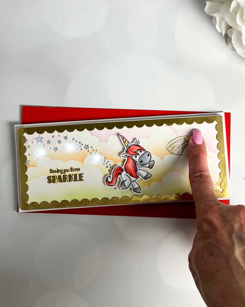 Adhered the panel to a slimline card base, then add some star dust stickles to the unicorn horn!