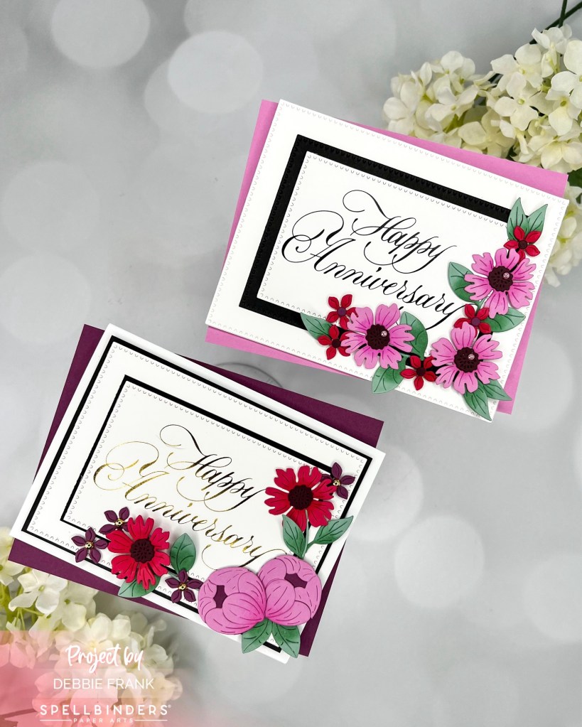 After I did the foiling on Hammermill Premium cardstock, I die cut it out with a smaller Perfect Touch Rectangle Dies. I went up a size to mat in black the card (one on top) with the Three Pink flowers. The lower on I did in White but I did mat both panels with Black. These Perfect Touch Rectangle Dies have 7 layers to them and I love that just for this reason.