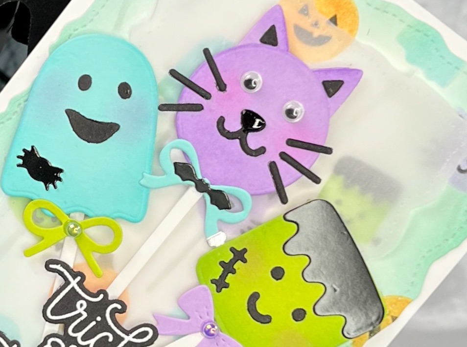 Next I die cut out the Halloween Cake Pop dies, I went with the adorable Kitty, Ghost and the Frankenstein over the pumpkin. I love Frankie so much! Once I added the faces and of course some googly eyes, they needed some cheeks so I used a very small round brush. After they were all assembled I popped them up with foam squares.