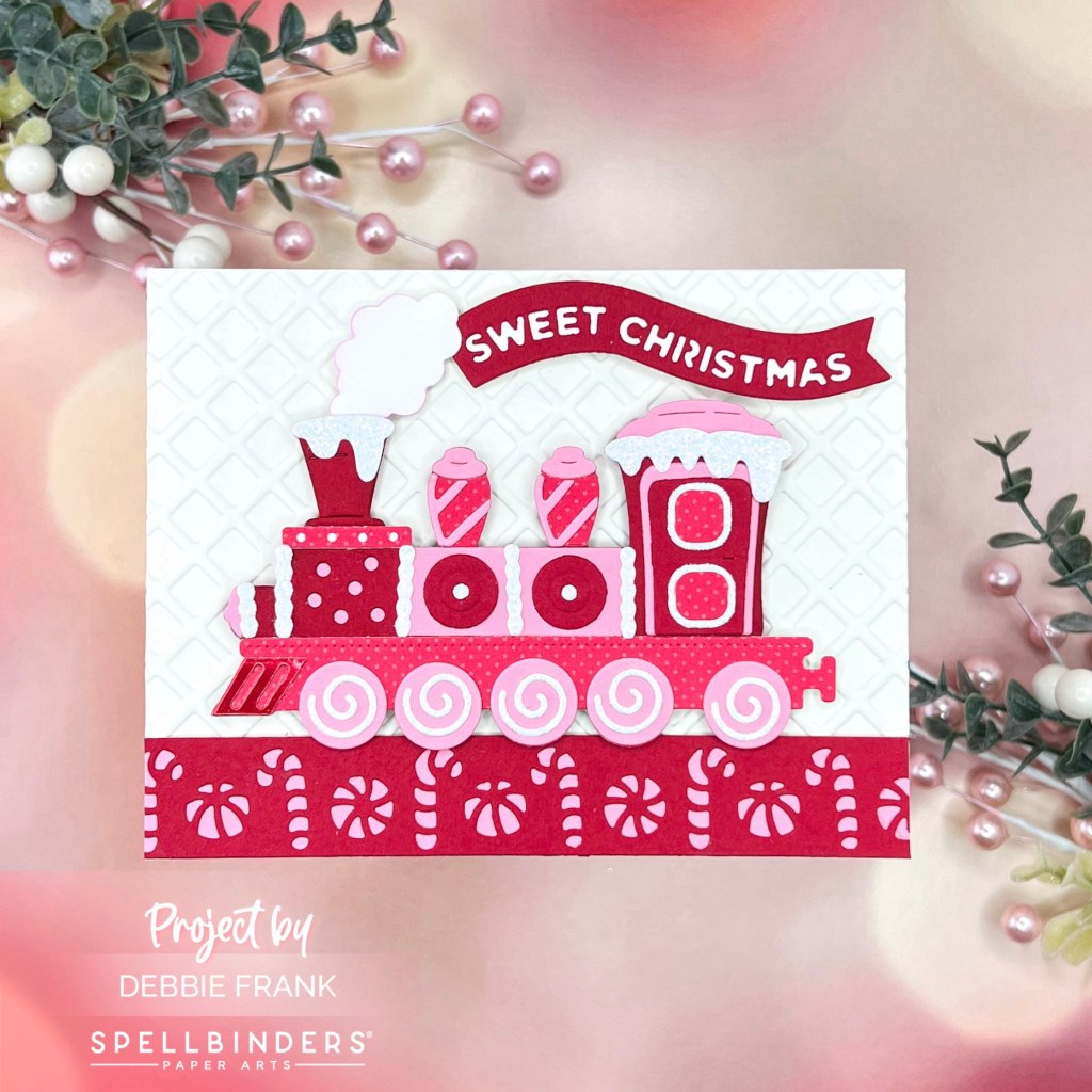 Next, I die cut out the Gingerbread Train etched Dies using a polka dot card stock in my stash, probably a Doodlebug pack. With all the pieces that looked like icing I used Pixie Dust card stock from Lawn Fawn. With the three colors and the glitter card stock this was actually pretty easy to put together. The hardest part was which to use for the grill. I ended up using the Treasured Card stock- Ruby the one that is metallic.