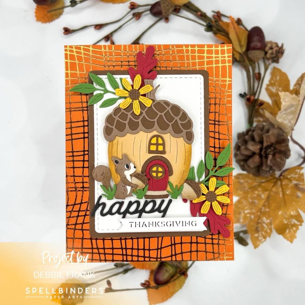 Hi Crafty Friends, back with another Spellbinders Club of the Month card. Today I’m showcasing the Gilded Weave Glimmer of the Month along with the Acorn Acres Large Die of the Month club.