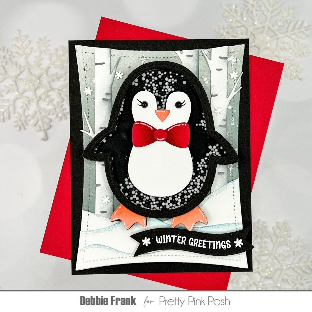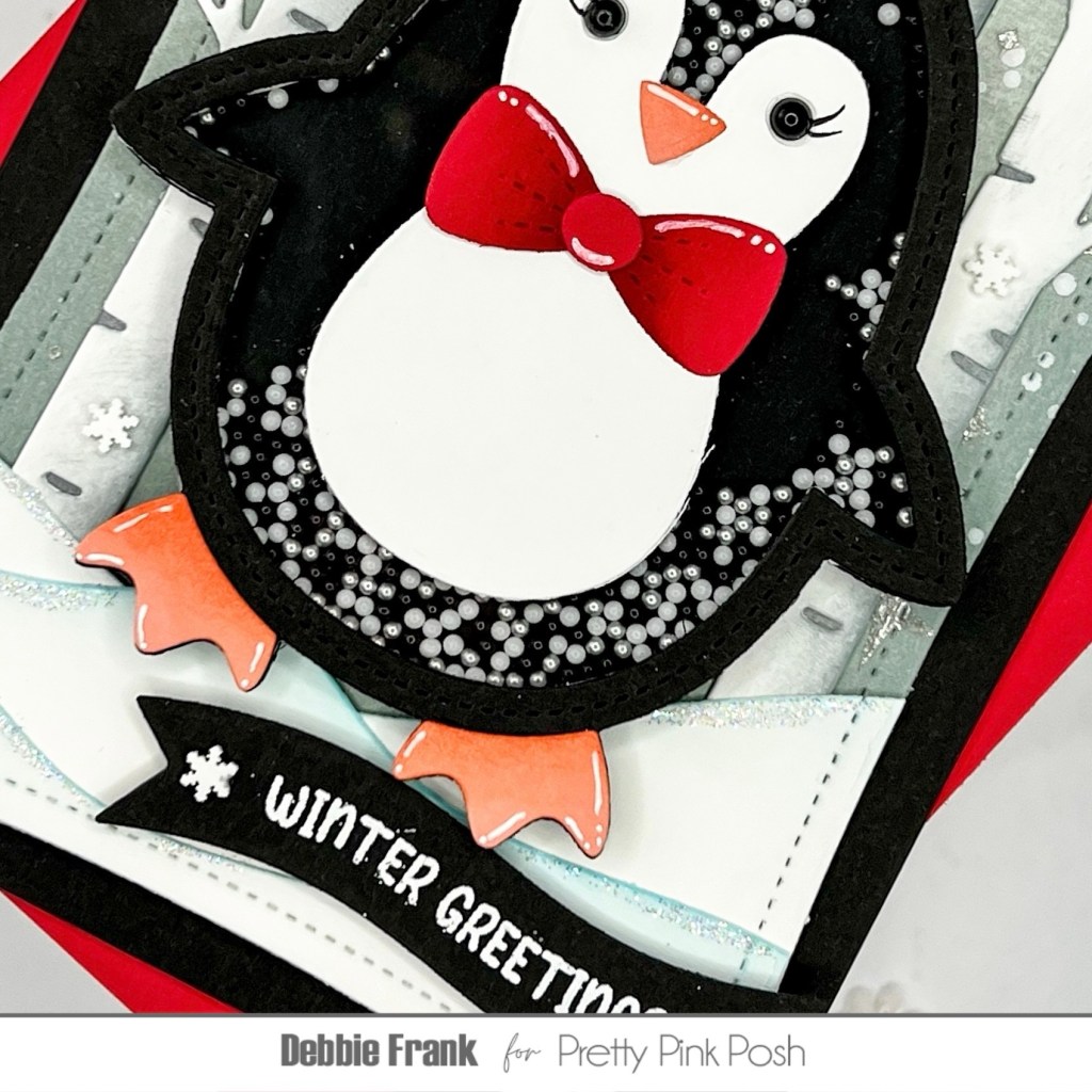 Today, I have the super cute Penguin Shaker! He is so darn cute and I have him all decked out! I just had to give him a red bow, love the pop of red with him! I die cut him out of black card stock twice, one for a frame and the backing. Then once with Acetate for the window. Then cut one of the black die cuts again with the inner piece run it through to make the frame. Attach the acetate to the back and then add foam stripes to make a well. I filled it up with the new Black Tie Beads and adhered with the backing. Flip to the front and attach the face, I did add some lashes.