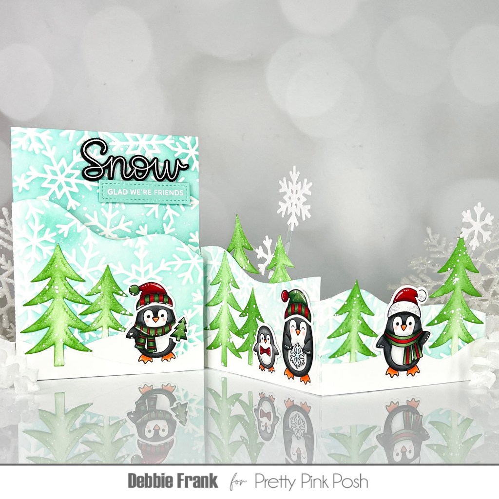 I love this card, it looks like it would be hard to make but it was actually really easy to make. You just need to have enough penguins and trees made up.