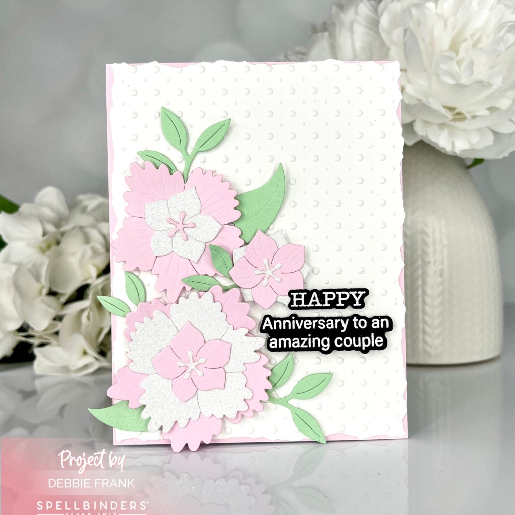 I almost forgot the sentiment! I stamped and white heat embossed the “Happy Anniversary to an amazing Couple” from the Tabbed In & Out Sentiment Set. Then with the dies in the set I die cut out the sentiment. Popping it up with foam squares and attached to the panel.