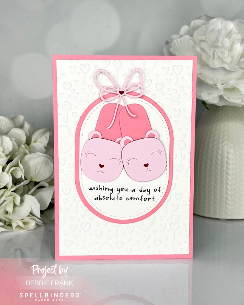 For the “Wishing you a day of absolute comfort” I used from last month’s release of the Cozy Toes Friends Clear stamp set. It doesn’t come with dies, so I used the Scalloped and Stitched Edge Ovals Etched Dies. With the smaller Stitched oval die I die-cut it out of white and then stamped out the sentiment onto it.