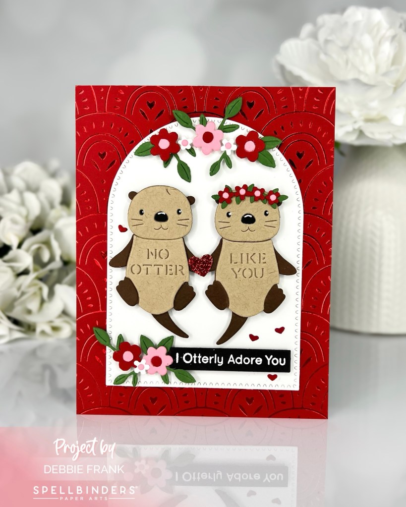 Since I knew I was going with browns for the otters. I thought how cute would it be if I did a tone on tone with the Red Foil and Red card stock using the Soft Hearted Glimmer Plate.