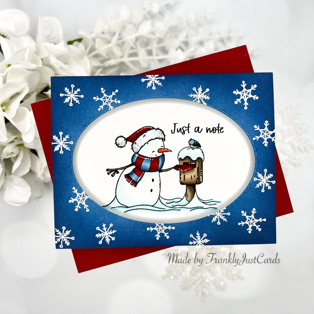 Before I attach the two panels, I stamped out the sentiment “Just a Note” from the set. Then on the back of the window panel I added foam to lift it up. Placing it on the other panel with the snowman in the center. If there was any of the back panel hanging out I just cut it off.