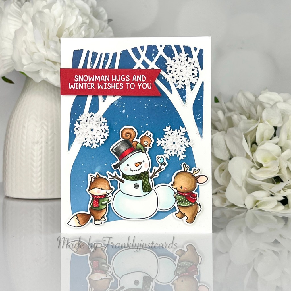 With the Hello Bluebirds Winter Woods Overlay Die Plate, I die-cut it of white card stock. Adhering it directly to the blended background panel and attaching the stamped images.