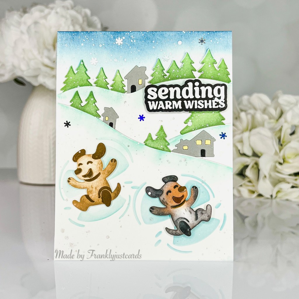 Hi friends, I’m finally pulling out the Snow Angel Pups Duo Die-N-Stencil along with the Snowy Hills Bundle from Waffle Flower Crafts Pawder Day Release. I knew I wanted to make this Christmas Card for a friend that works in a Veterinary office and has two Bernese Mountain Dogs.