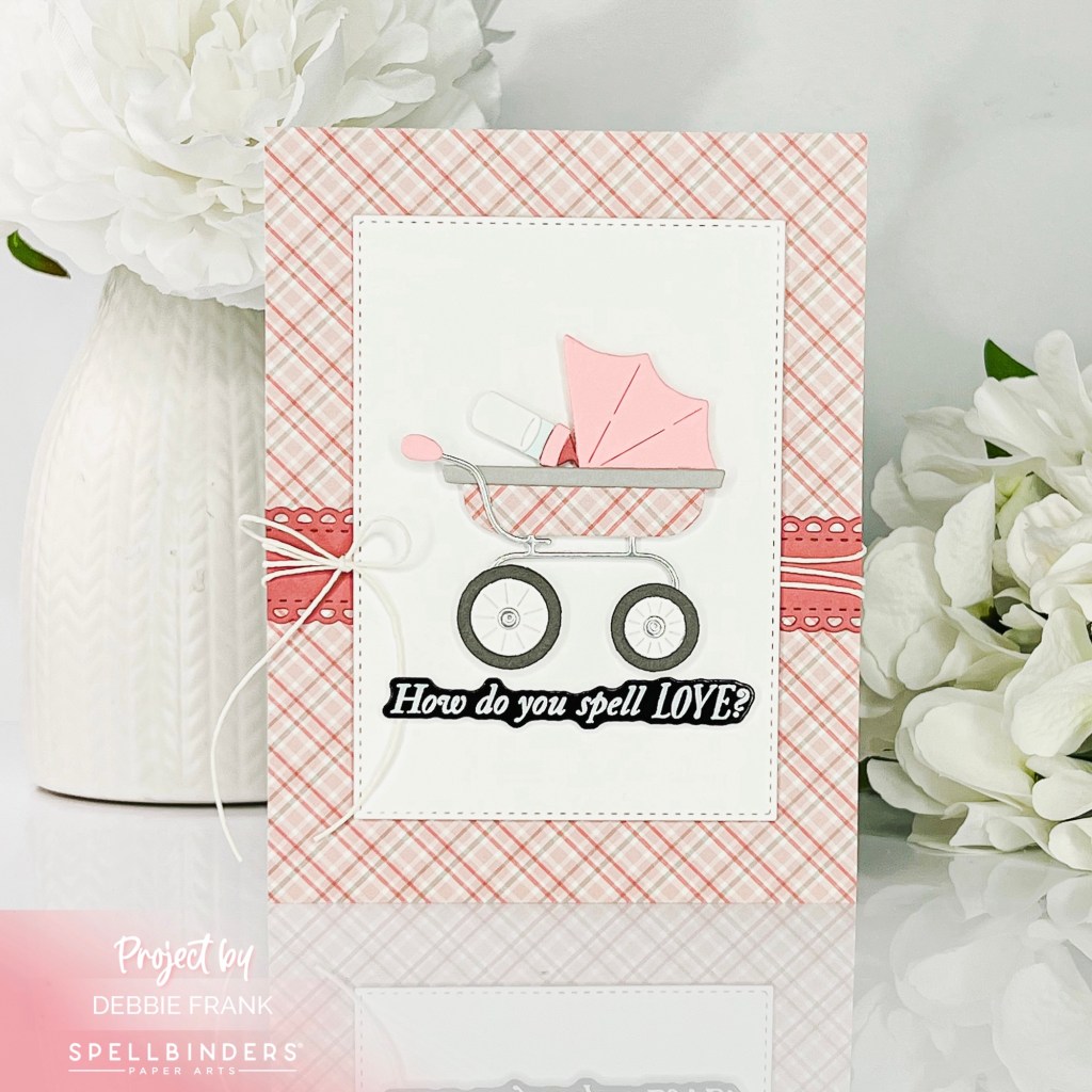 With the Nested Postage Labels & Tag dies, with the second to largest stitched die I die cut out a white panel. Popping up the Buggy with foam squares onto the panel.