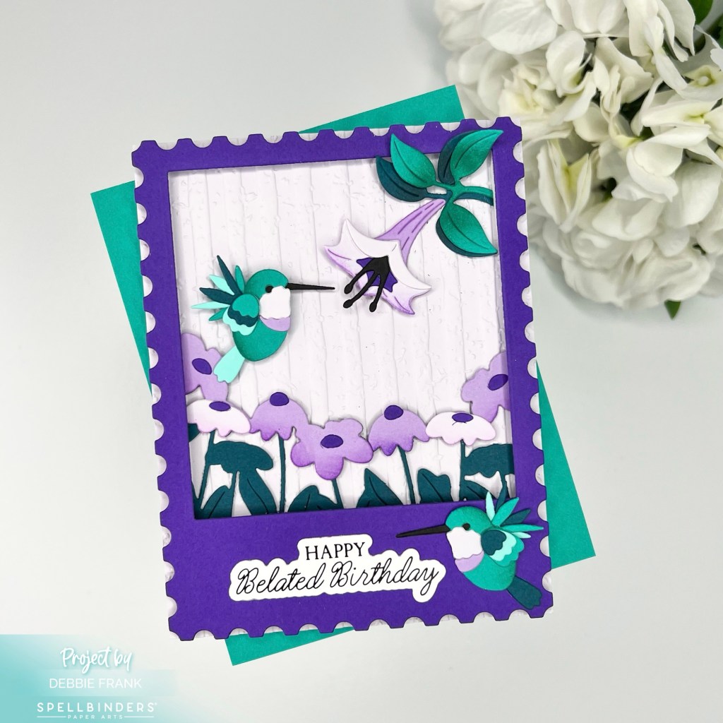 Here is the Large Die of the Month Club- Hummingbird Delight. I went with the Color cube for my color inspiration. I love the big postage die for the frame of the flowers and hummingbirds.