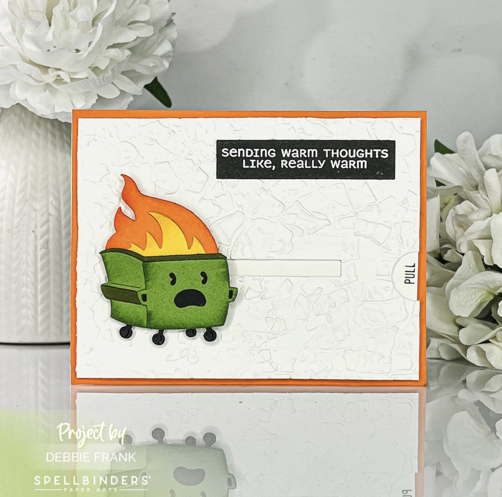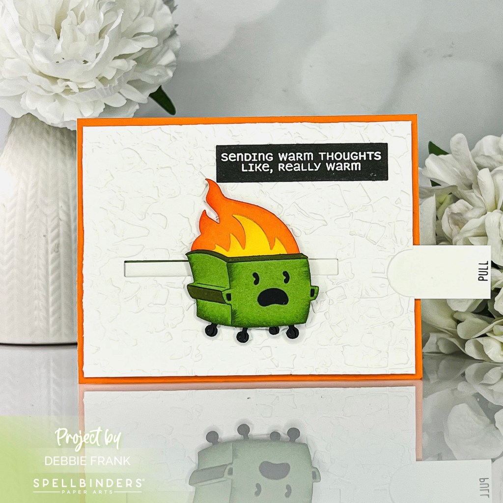 I started off die-cutting out the Dumpster fire and doing some ink blending on the edges. Next, with a standard A2 panel of white card stock and a sentiment strip die. I figured out where the dumpster should move along and set the die there to make a channel for a slider.