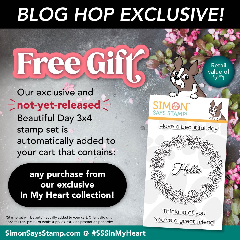 Not-yet-released Simon Says Stamp Beautiful Day 3×4 stamp is automatically added to your cart that contains any purchase from the Simon Says Stamp exclusive In My Heart collection! This gift with purchase will expire 3/22 at 11:59 pm EDT or while supplies last.