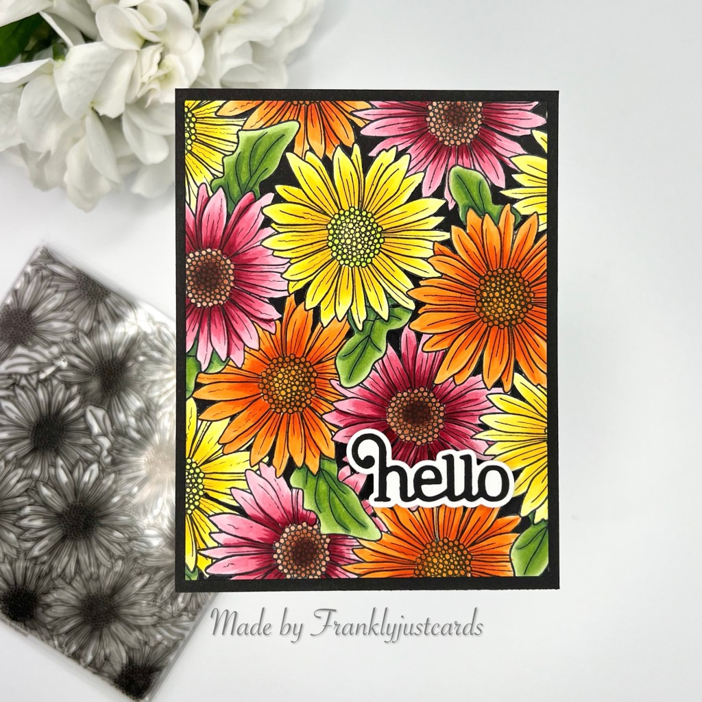 With my second card I went more dramatic and used my copics. I used three shades for each color and went in with a flicking motion. Once the flowers were all colored I went in with the Copic 100 and filled in the open spaces. Trimmed in down and matted with black card stock and added the previously released Giggle Hello Die for the sentiment.
