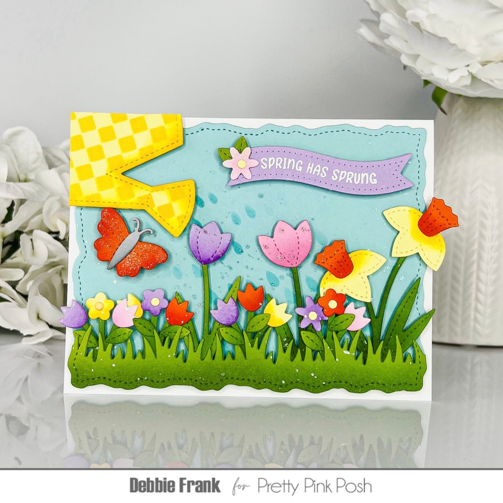 From the Springtime Holder Addition Dies there is the perfect sized Butterfly die. I needed more flowers that were higher to fill my sky. So with the spring Florals Dies set I die cut out the smaller Daffodils to bring the Yellow to the other side of the card.