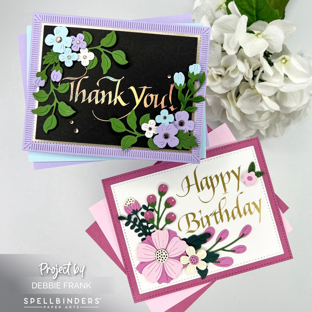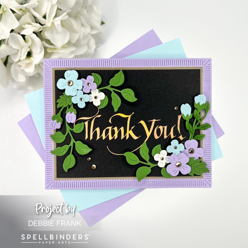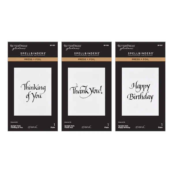 Hi friends, how beautiful are these Upright Italic BetterPress Plates by Paul Antonio of the Upright Italic Everyday Sentiments Collection over at Spellbinders? Today, I’m using the “Happy Birthday” with a Matte gold foil and the “Thank You” with Aura Foil on Raven Black Card Stock.