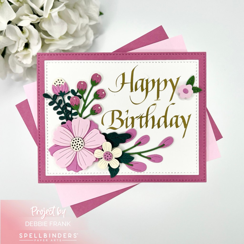 For my second card I decided to have the sentiment up higher on the panel. I die-cut it out with the Perfect Touch Rectangle and tag Dies. For the flowers with this card, I used an oldie but a goodie Be Bold Blooms die set.