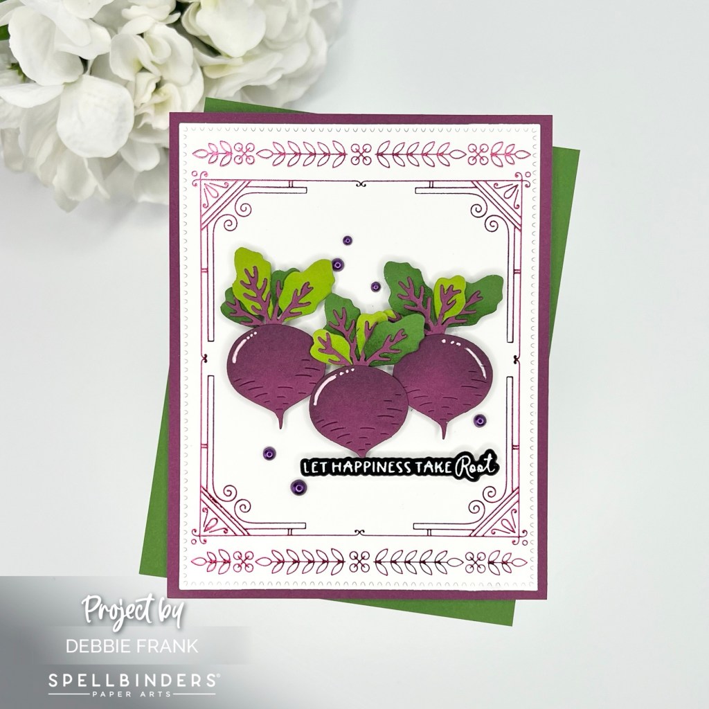 Next with the Large Die of the Month Club I die-cut out three of the Beet dies. Die a little ink blending for dimension and added white highlights. Popping them up and adhering to the panel. I went back and foiled the sentiment with white foil onto black glossy card stock.