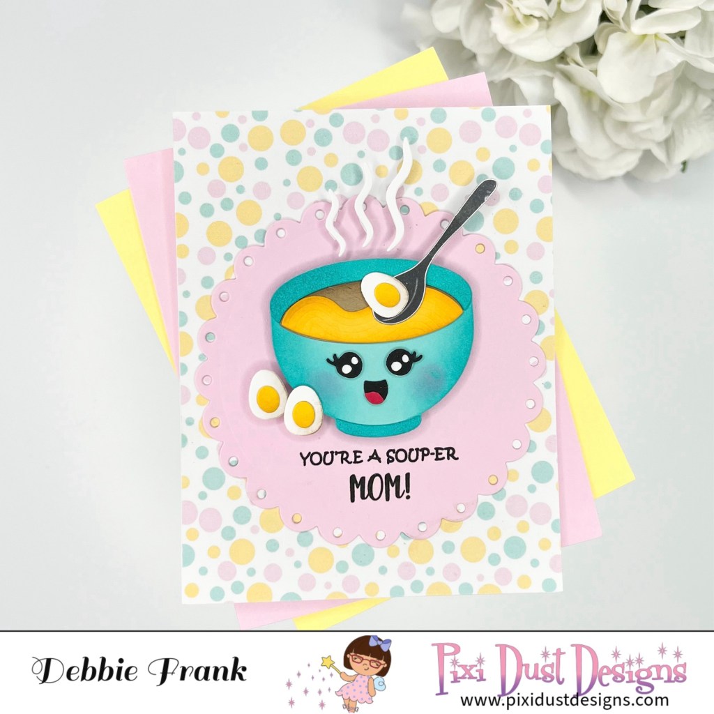 Hi Crafty Friends, here with the new Soup-er Mom dies from the Mother’s Day Release! Pixi Dust Designs always has the best puns along with the absolutely most adorable dies with those faces!