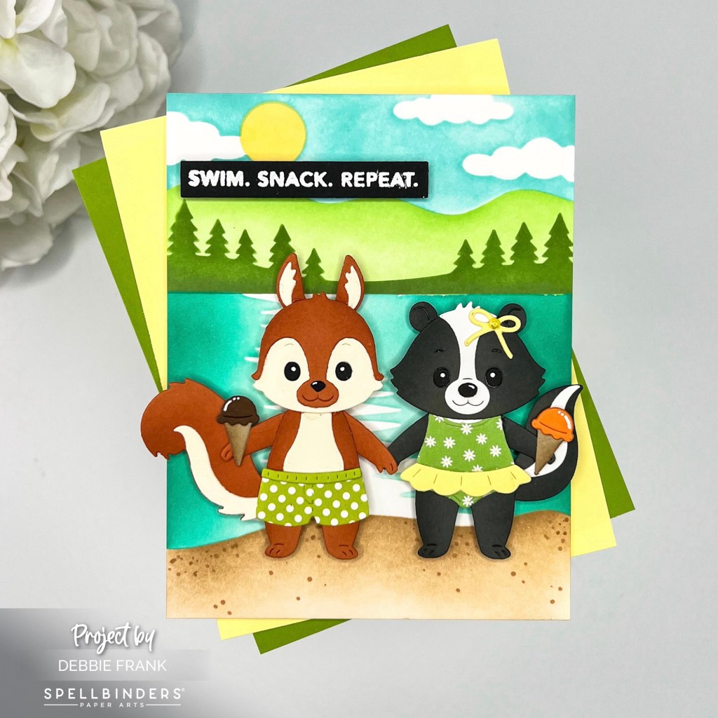 Since the sentiment was “Swim. Snack. Repeat” that I stamped and white heat embossed. I had to use the ice cream cone using the Summer Days Etched Dies.